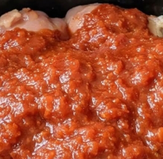 Pour the tomato sauce over the chicken, making sure each piece is coated. If you’re adding optional seasoning, sprinkle it over the top now.