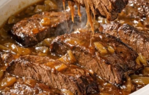 Once the beef is fork-tender, gently stir or nudge the slices to coat them in the gravy. Taste the gravy and adjust the seasoning if needed with a pinch of salt or pepper, keeping in mind that the onion soup mix is already salty.