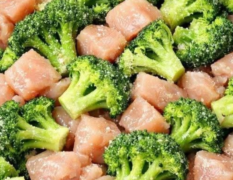 At this stage, it will look like raw diced chicken and bright green broccoli tossed in a shiny sauce.