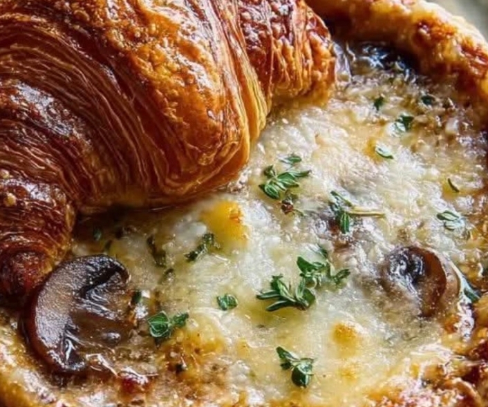 - Assemble: Ladle the soup into bowls. Place the cheesy croissant halves on top of each bowl of soup. Garnish with additional fresh thyme.