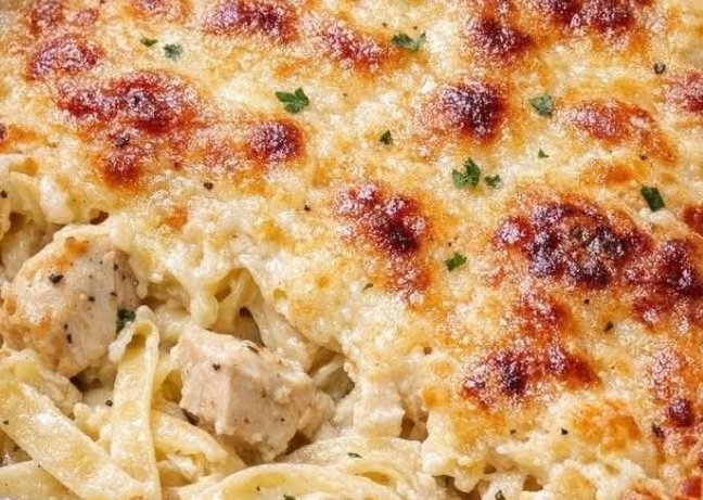 Add cooked pasta and chicken to the sauce. Mix well. - Assemble & bake