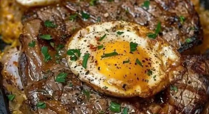 Ingredients:- 2 ribeye steaks (about 1-inch thick)- 4 large eggs- 2 tablespoons olive oil- 2 tablespoons unsalted butter- Salt and freshly ground black pepper to taste- 1 teaspoon fresh thyme leaves- 1 garlic clove, mincedDirections:1. Season the steaks generously with salt and pepper.2. Heat a skillet over medium-high heat and add 1 tablespoon olive oil. Once hot, add the steaks to the skillet and cook for about 4-5 minutes on each side for medium-rare, or until desired doneness. Remove from skillet and let rest.3. In the same skillet, reduce heat to medium. Add butter, garlic, and thyme, cooking until butter melts and is fragrant.4. Crack the eggs into the skillet, being careful not to break the yolks. Season with salt and pepper. Cook until the whites are set but yolks are still runny, about 2-3 minutes.5. Serve the steaks with eggs on top, spooning some of the garlic-thyme butter over them.Prep Time: 10 minutes | Cooking Time: 15 minutes | Total Time: 25 minutesKcal: 650 kcal | Servings: 2
