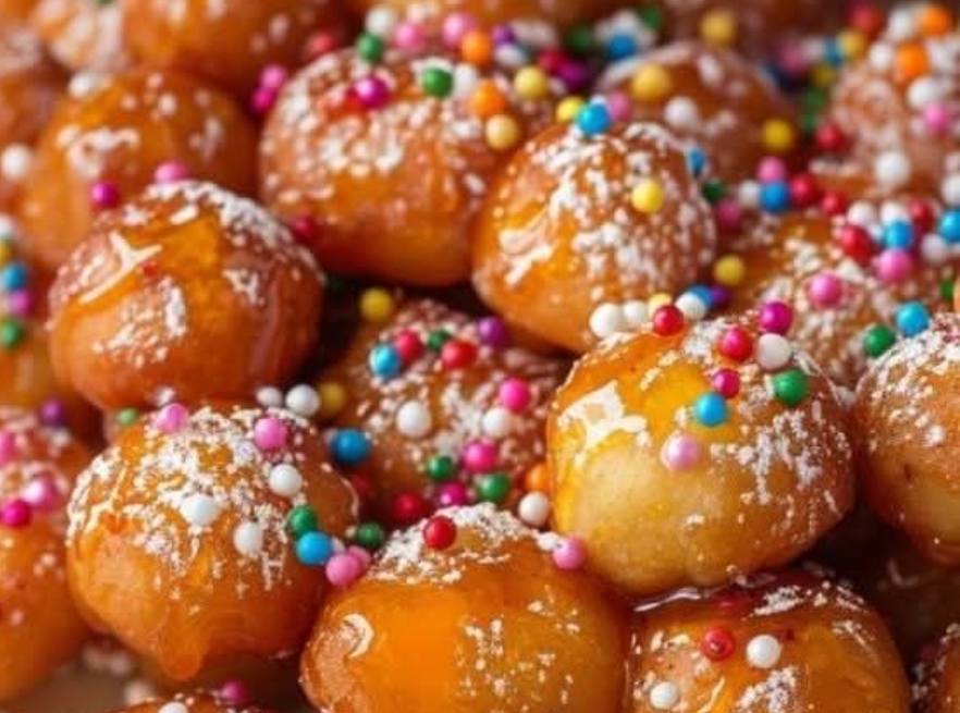 Ingredients:* 2 cups all-purpose flour* 1/4 cup granulated sugar* 3 large eggs* 1/4 cup unsalted butter, melted* 1/2 cup honey* Zest of 1 lemon and 1 orange* Vegetable oil for frying* Rainbow sprinkles for decoration* Pinch of saltInstructions:* Mix Dough: In a large bowl, mix the flour, sugar, and salt. Add the eggs, melted butter, and citrus zest. Mix until a dough forms.* Shape Dough: Divide the dough into small portions and roll into thin ropes. Cut the ropes into small, pea-sized pieces.* Heat Oil: In a large pot, heat vegetable oil to 350°F (175°C).* Fry Dough Balls: Fry the dough balls in batches until golden brown, about 2-3 minutes per batch. Remove with a slotted spoon and drain on paper towels.* Coat with Honey: In a large saucepan, warm the honey over low heat. Add the fried dough balls and stir to coat evenly.* Serve: Arrange the honey-coated Struffoli on a platter and decorate with rainbow sprinkles. Serve immediately.