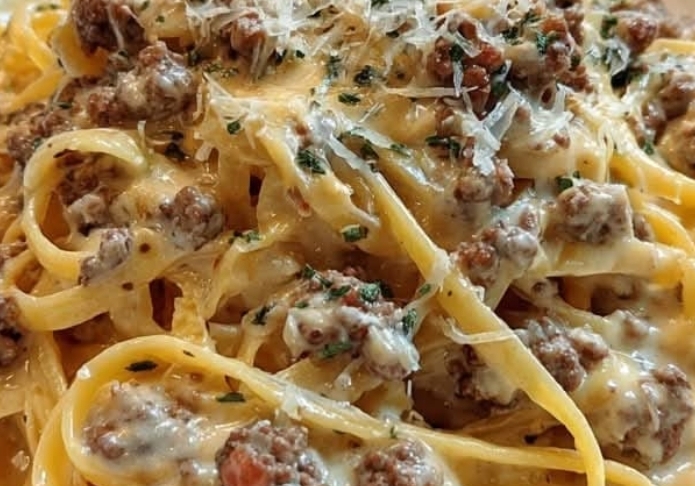 6️⃣ Return the cooked beef to the skillet. Add linguine and toss to coat in the cheesy garlic butter Alfredo sauce.