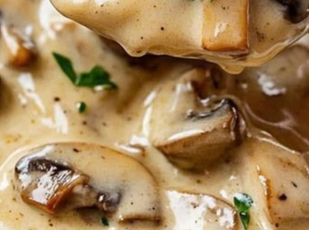 Ingredients:500 g (about 1 lb) fresh mushrooms, sliced1 medium onion, finely chopped3 garlic cloves, minced3 tbsp butter2 tbsp all-purpose flour4 cups warm chicken or vegetable broth1 cup heavy cream2 tbsp olive oilSalt and black pepper, to tasteA pinch of dried thyme or rosemary (optional)Fresh parsley, chopped (for garnish)Instructions:In a large pot, heat the butter with olive oil. Add the onion and garlic, and sauté until softened.Add the sliced mushrooms and cook until they release their juices and turn golden.Sprinkle the flour over the mushrooms and stir well to combine.Gradually pour in the broth while stirring continuously to avoid lumps.Bring the soup to a boil, then reduce the heat and let it simmer for about 15 minutes.Stir in the heavy cream and mix gently until the soup becomes creamy.Season with salt, black pepper, and a pinch of thyme or rosemary if desired.Serve hot, garnished with fresh parsley and a side of crusty bread.Notes:For a smoother texture, blend half of the soup and return it to the pot before adding the cream.This hearty and creamy mushroom soup is perfect as a starter or a cozy light meal.