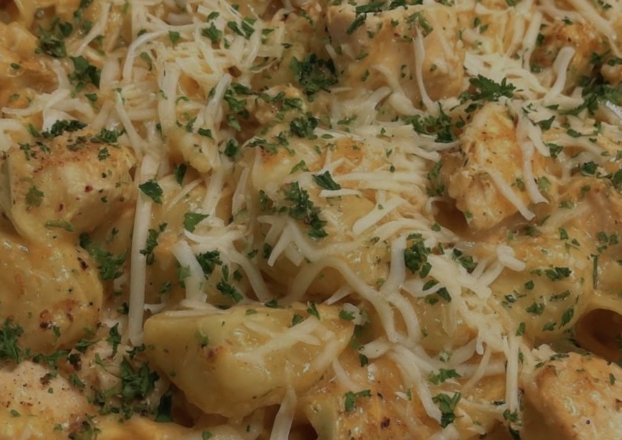 Ingredients: 1 lb boneless, skinless chicken breast, cut into cubes 3 cups fresh cauliflower florets 12 oz pasta (penne, rotini, or small shells) 1 ½ cups shredded cheddar cheese (divided) 1 cup shredded mozzarella cheese (divided) 4 oz cream cheese, cubed 1 ½ cups whole milk (or half-and-half for creamier texture) 1 cup chicken broth 3 cloves garlic, minced 1 tsp Italian seasoning ½ tsp salt (adjust to taste) ½ tsp black pepper 2 tbsp breadcrumbs (optional, for topping) Fresh parsley, chopped (for garnish) Directions: Prepare the Ingredients: In a large bowl, combine the cubed chicken, cauliflower florets, broccoli florets, pasta, minced garlic, Italian seasoning, salt, and black pepper. Mix well to combine. Layer in the Crockpot: Pour the mixture into the crockpot. Add the cream cheese, chicken broth, and whole milk (or half-and-half) over the top. Gently stir to combine all the ingredients. Add the Cheese: Sprinkle half of the cheddar and mozzarella cheese over the mixture. Cook: Cover and cook on low for 4-5 hours, or until the chicken is cooked through and the pasta is tender. Finish with Cheese: About 30 minutes before serving, sprinkle the remaining cheddar and mozzarella cheese on top. If using breadcrumbs, sprinkle them over the cheese for added crunch. Garnish and Serve: Once the cheese is melted and bubbly, garnish with chopped fresh parsley. Serve warm and enjoy this hearty, cheesy pasta bake!Nutritional Information: ⏰ Prep Time: 15 minutes | Cook Time: 4-5 hours | Total Time: 4-5 hours 15 minutes 🔥 Kcal: Approximately 350 kcal per serving | 🍽️ Servings: 6