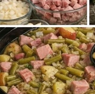 Add green beans, potatoes, ham, onion, and garlic to the slow cooker.