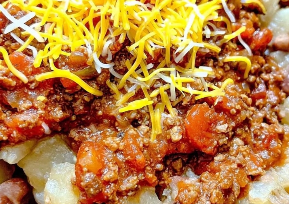 when the potatoes are tender, pour the taco meat mixture over the top. Stir to coat the potatoes evenly. Top with cheese and serve.