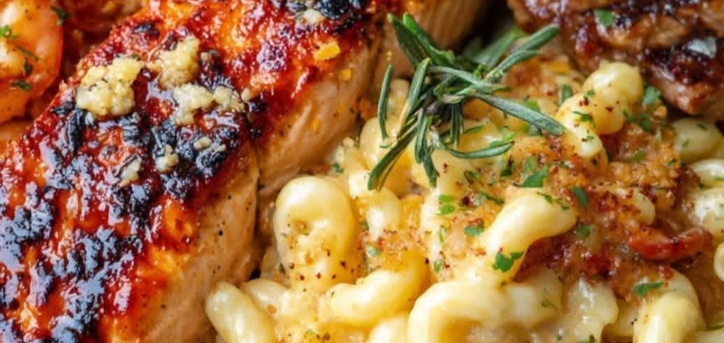 Sweet glaze, garlicky shrimp, savory lamb, and creamy mac — this plate is indulgence done right