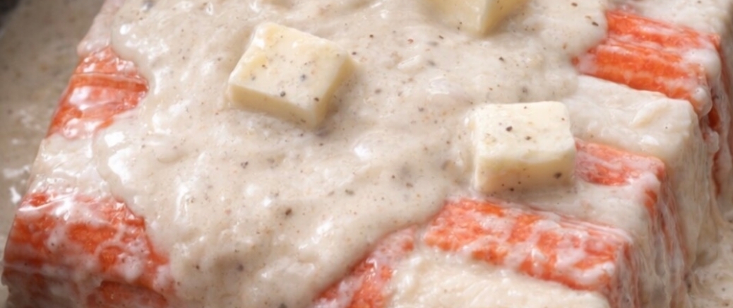 Dot the top with the pieces of unsalted butter, spacing them out so they melt and enrich the sauce evenly as the mixture warms.Creamy sauce poured over imitation crab in the slow cooker