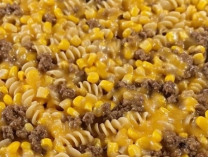 Assemble Casserole: In a baking dish, combine cooked pasta, beef, corn, BBQ sauce, and shredded cheese.