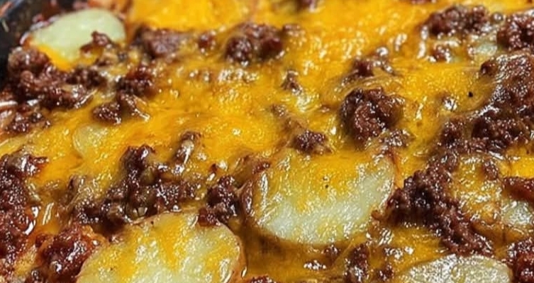 IngredientsFor the Meat Layer1 lb ground beef1 small onion, diced2 cloves garlic, minced1 teaspoon salt½ teaspoon black pepper1 teaspoon paprika1 teaspoon Italian seasoningFor the Potato Layer4 medium potatoes, peeled and thinly sliced1 teaspoon salt½ teaspoon black pepper½ teaspoon garlic powderFor the Sauce1 (10.5 oz) can cream of mushroom or cream of chicken soup½ cup milk½ cup sour creamFor the Topping1½ cups shredded cheddar cheese2 tablespoons chopped parsley (optional)InstructionsPreheat the OvenPreheat your oven to 375°F (190°C).Grease a 9×13-inch baking dish.Cook the Ground BeefIn a skillet over medium heat, cook ground beef until browned.Add diced onion and garlic; sauté 2–3 minutes.Season with salt, pepper, paprika, and Italian seasoning.Drain excess grease and set aside.Prepare the SauceIn a small bowl, whisk together the condensed soup, milk, and sour cream until smooth.Layer the CasseroleIn the baking dish, place half of the sliced potatoes in an even layer.Sprinkle lightly with salt, pepper, and garlic powder.Spread half of the cooked beef mixture over the potatoes.Drizzle with half of the sauce.Repeat: potatoes → beef → sauce.BakeCover with foil and bake for 55–65 minutes, or until potatoes are tender.Add the CheeseRemove foil, sprinkle cheddar cheese over the top, and bake uncovered for another 10–15 minutes, until melted and bubbly.ServeLet rest 5 minutes. Garnish with parsley if desired. Serve warm.TipsAdd sliced mushrooms or corn for extra flavor.Yukon gold or russet potatoes work best.For a richer casserole, stir ½ cup shredded cheese directly into the sauce.Leftovers reheat well in the oven or air fryer.