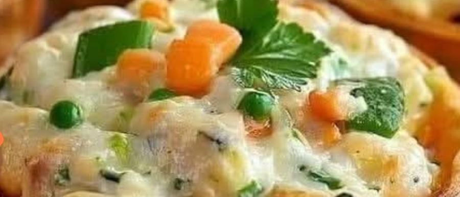 - In a large bowl, combine the cooked chicken, frozen mixed vegetables, cream of chicken soup, shredded cheddar cheese, garlic powder, onion powder, salt, and pepper. Mix until well combined.