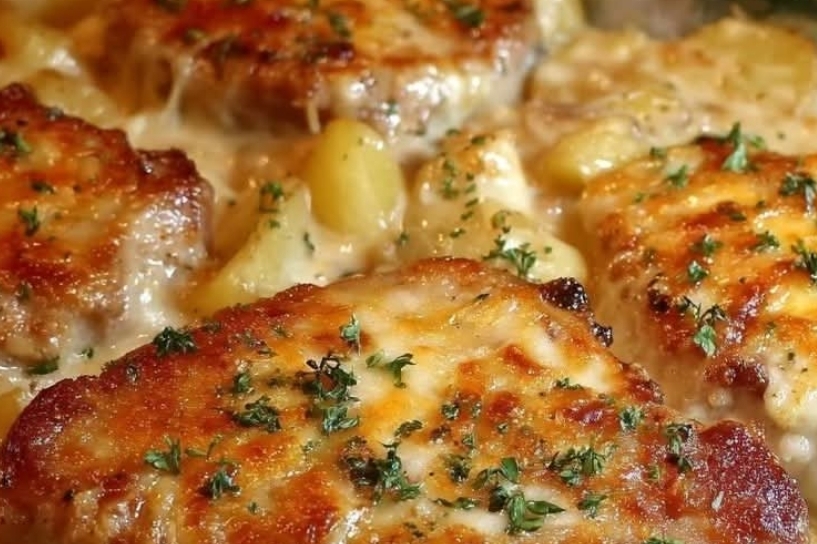 In a medium bowl, combine the soup and the milk. Arrange the potatoes and onions in a 9×13 inch baking dish. Place the browned chops over the potatoes and onions, then pour the soup mixture over all.