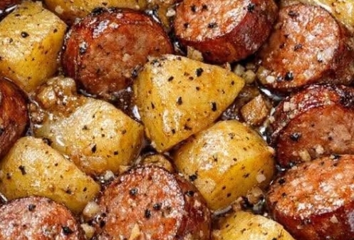 Scatter the sliced smoked sausage rounds over the potatoes in an even layer. The sausage will render a bit of fat as it cooks, helping to brown the edges and flavor the potatoes underneath.