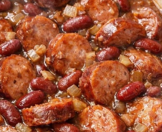 Serve hot straight from the slow cooker, making sure each portion has plenty of sausage, beans, onions, and gravy.