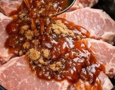 Pour the ketchup and brown sugar sauce evenly over the raw pork chops and onions in the slow cooker, making sure all of the chops are coated. Use a spatula to scrape every bit of sauce from the bowl over the meat.