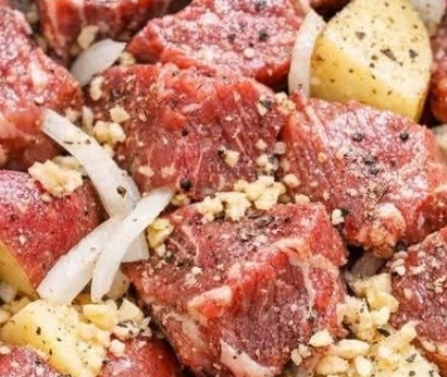 Arrange the cubed chuck roast evenly on top of the potatoes and onions. Positioning the meat above the vegetables allows it to braise gently in the liquid while its juices drip down, enriching the entire stew.