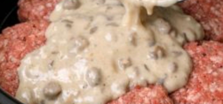 Pour the cream of mushroom soup mixture evenly over the raw hamburger patties in the slow cooker, making sure each patty is covered so they braise gently in the sauce as they cook.