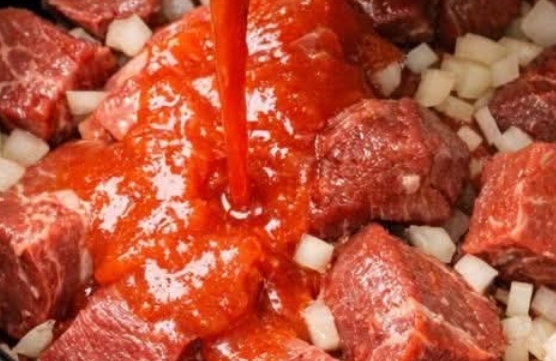 Slowly pour the tomato juice over the beef and vegetables, making sure to cover everything. You should see the raw beef chunks just submerged under the bright red juice.
