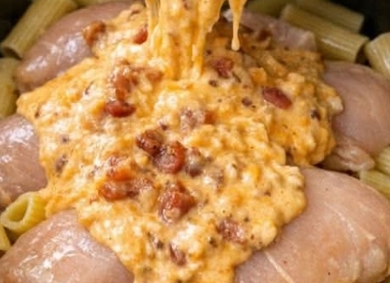 Pour the mixture over the chicken and pasta: Holding the bowl with both hands, slowly pour this one cheesy bacon mixture evenly over the raw chicken breasts and rigatoni in the slow cooker, making sure to cover as much of the pasta and chicken as you can. Use a spatula to scrape out every last bit of sauce from the bowl.