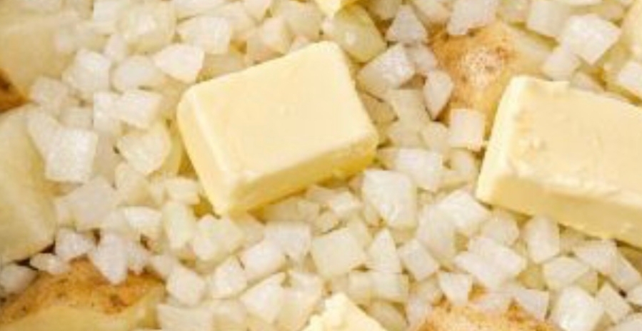 4. Combine in the slow cooker: Pour the creamy mixture over the potatoes and onions. Use a spatula or large spoon to gently stir until the potatoes are evenly coated.