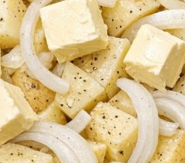 Layer in the slow cooker: Place the sliced onion and minced garlic in the bottom of a 5- to 6-quart slow cooker. Add the potato chunks on top. Scatter the butter pieces over the potatoes.