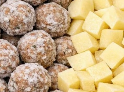 - Pour mixture over meatballs and potatoes.