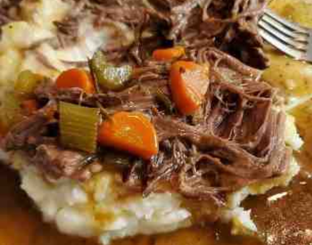 IntroductionNothing says comfort food like a tender slow cooker pot roast served with rich homemade gravy and creamy mashed potatoes. This classic recipe is perfect for busy days—just set it in the slow cooker and let it work its magic. By the end of the day, you’ll have melt-in-your-mouth beef, flavorful vegetables, and silky gravy ready to serve with fluffy mashed potatoes. It’s the ultimate hearty dinner for family gatherings or cozy nights at home.IngredientsFor the Pot Roast:3–4 pounds beef chuck roast1 onion, sliced4 carrots, cut into chunks1 pound baby potatoes (optional, if not serving with mashed potatoes)4 cloves garlic, minced2 cups beef broth1/2 cup red wine (optional, for depth of flavor)2 tablespoons tomato paste2 tablespoons Worcestershire sauce2 sprigs fresh rosemary2 sprigs thyme2 bay leaves2 tablespoons olive oilSalt and black pepper, to tasteFor the Gravy:2 tablespoons cornstarch2 tablespoons cold waterFor the Mashed Potatoes:2 pounds potatoes, peeled and cubed4 tablespoons butter1/2 cup milk (or heavy cream, for richer flavor)Salt and pepper, to tasteInstructionsPrepare the RoastPat the beef dry and season generously with salt and black pepper.Heat olive oil in a skillet over medium-high heat. Sear the roast on all sides until browned.Assemble in the Slow CookerPlace onion, carrots, and garlic at the bottom of the slow cooker.Add the seared roast on top of the vegetables.Pour in beef broth, wine (if using), tomato paste, and Worcestershire sauce.Add rosemary, thyme, and bay leaves.Slow CookCover and cook on low for 8–9 hours or high for 4–5 hours, until the beef is fork-tender.Make the Mashed PotatoesWhile the roast cooks, boil the cubed potatoes in salted water until tender.Drain and mash with butter, milk, salt, and pepper until smooth and creamy.Prepare the GravyRemove the roast and vegetables from the slow cooker.Strain the cooking liquid into a saucepan.Whisk together cornstarch and cold water, then stir into the liquid.Simmer until thickened into gravy.ServeSlice or shred the beef and serve it with the vegetables.Spoon gravy over the roast and pair with creamy mashed potatoes.Serving SuggestionsGarnish with fresh parsley for a touch of color.Serve with a green salad or roasted Brussels sprouts for balance.Leftovers make delicious sandwiches or can be turned into a hearty beef stew.Tips & VariationsNo wine? Replace it with extra beef broth.Extra creamy mash: Add roasted garlic or sour cream to the potatoes.Make ahead: The roast tastes even better the next day as the flavors deepen.✨ This Slow Cooker Pot Roast with Gravy & Mashed Potatoes is a complete meal that’s rich, comforting, and perfect for feeding the whole family. With minimal prep and the magic of slow cooking, you’ll enjoy a restaurant-quality dinner right at home.